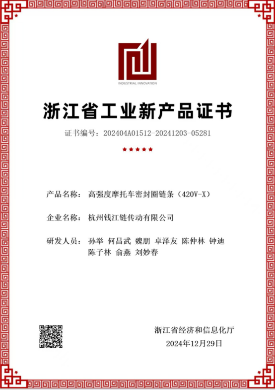 Model 420V-O(X) o wysokiej wytrzymałości z uszczelnionym olejem łańcuchem motocyklowym opracowany i wyprodukowany przez Hangzhou Qianjiang Chain Industries Co., Ltd. przechodzi certyfikację nowego produktu na poziomie prowincji