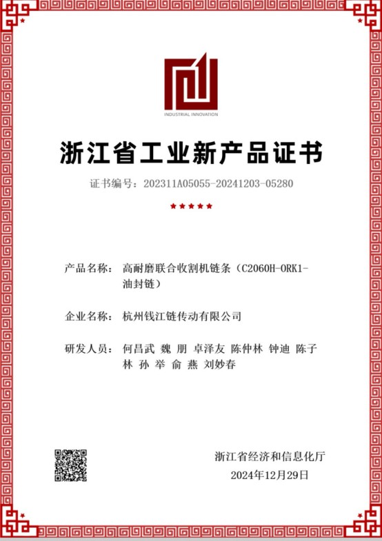 Łańcuch o wysokiej odporności na zużycie do maszyn rolniczych i żniwnych przechodzi certyfikację na poziomie prowincji