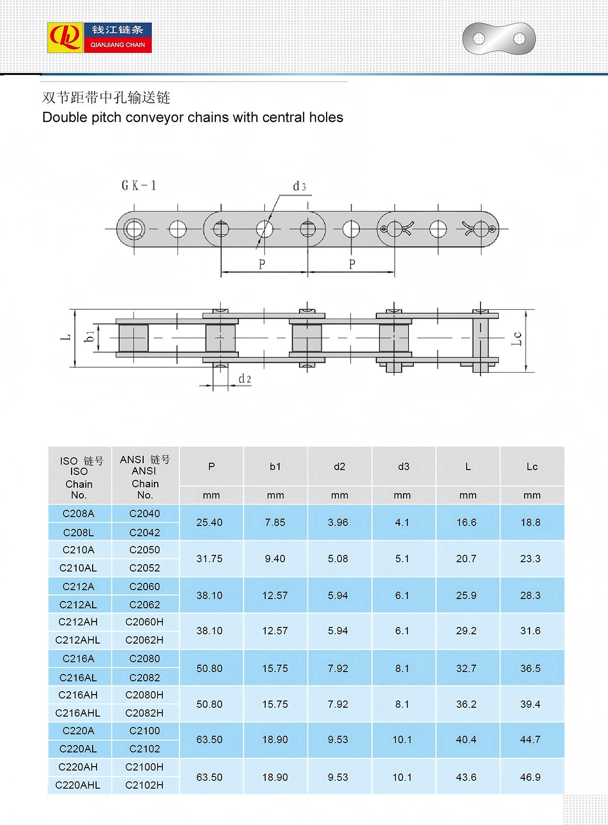 Łańcuchy przenośnikowe o podwójnej podziałce z otworami centralnymi