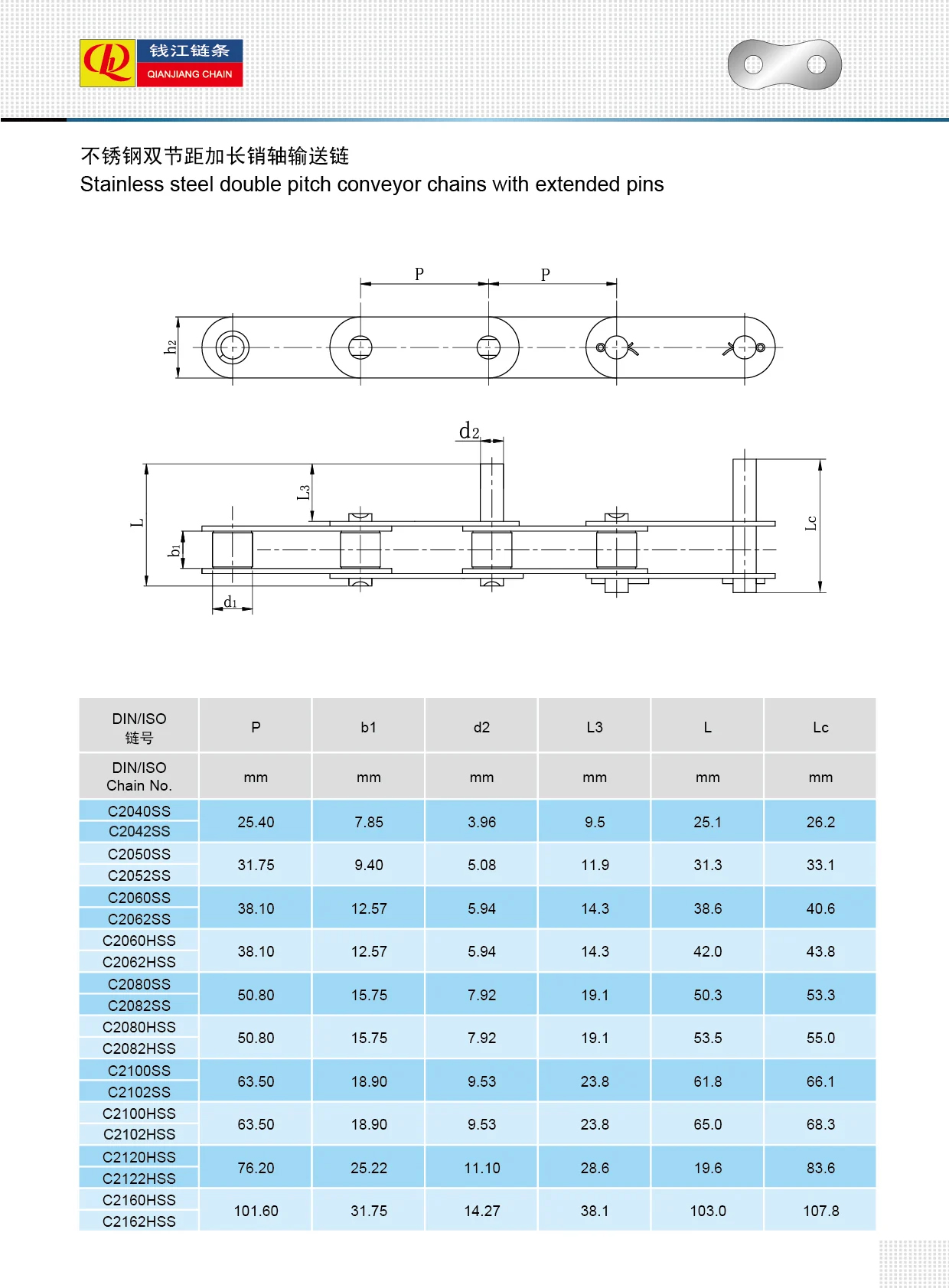 Łańcuchy przenośnikowe ze stali nierdzewnej o podwójnej podziałce z przedłużonymi sworzniami